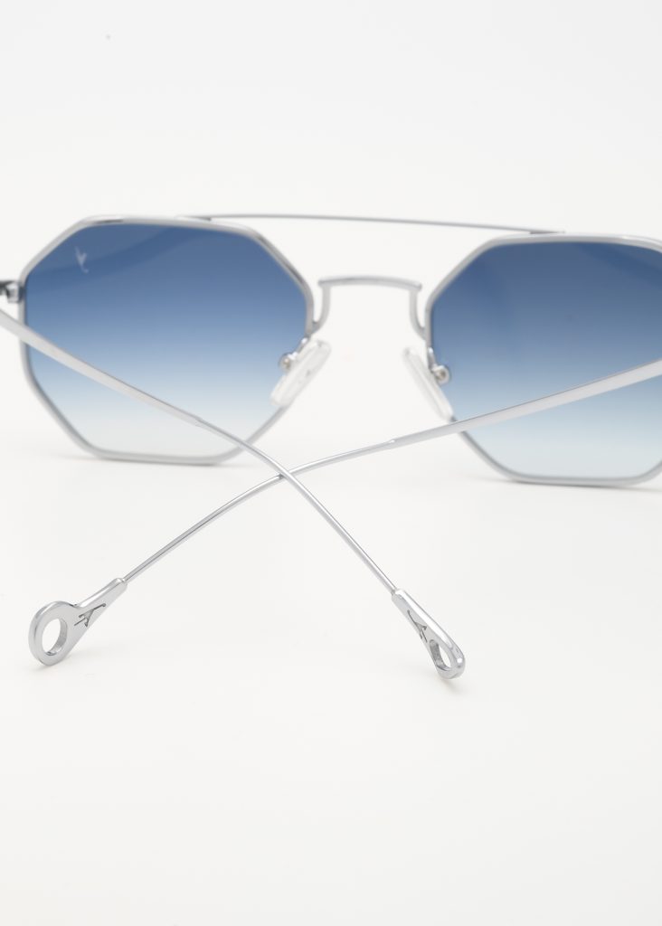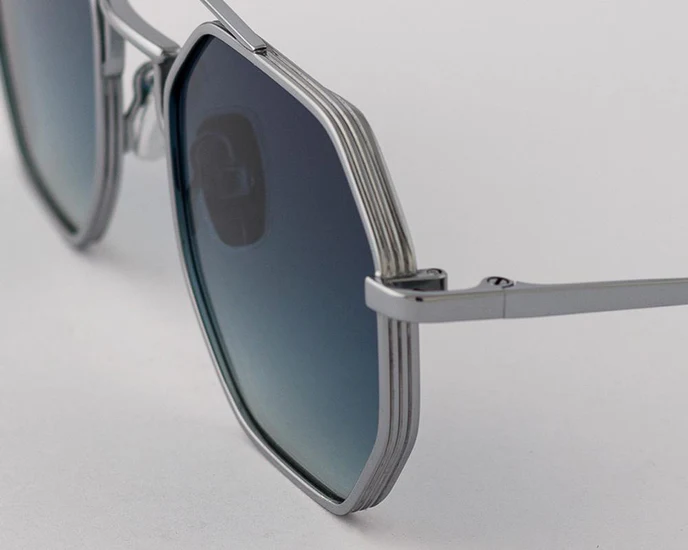 Occhiale da sole in acciaio di colore argento con lenti blu/sfumato