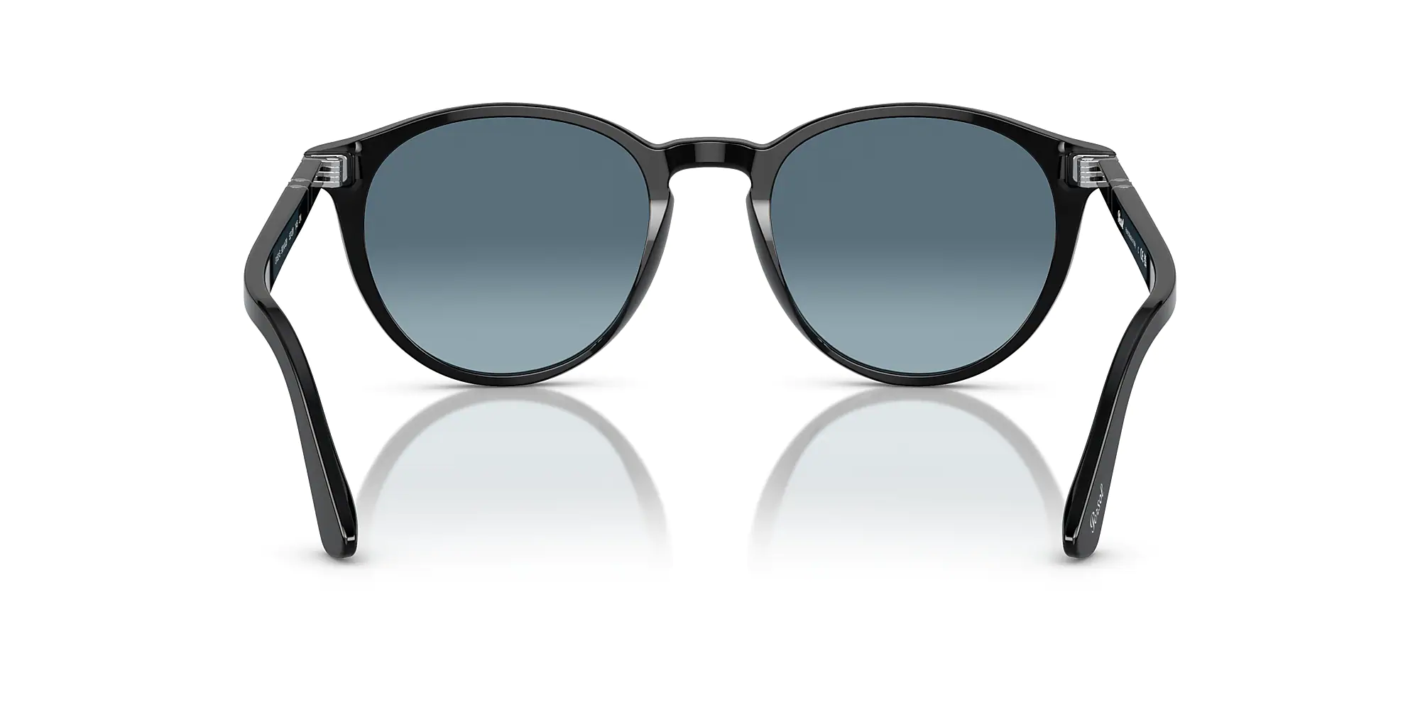 Occhiale da sole Persol modello maschile in celluloide nero lucido la forma e tonda, le lenti sono infrangibili azzurro sfumato.