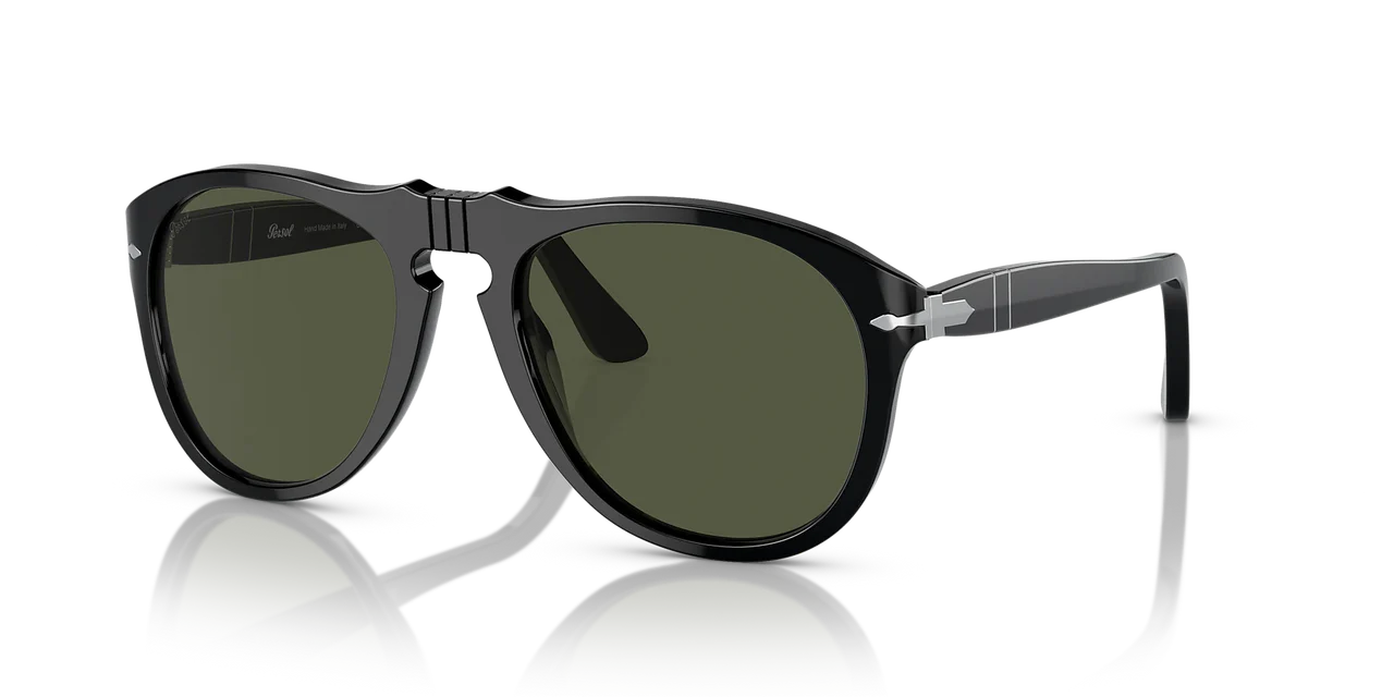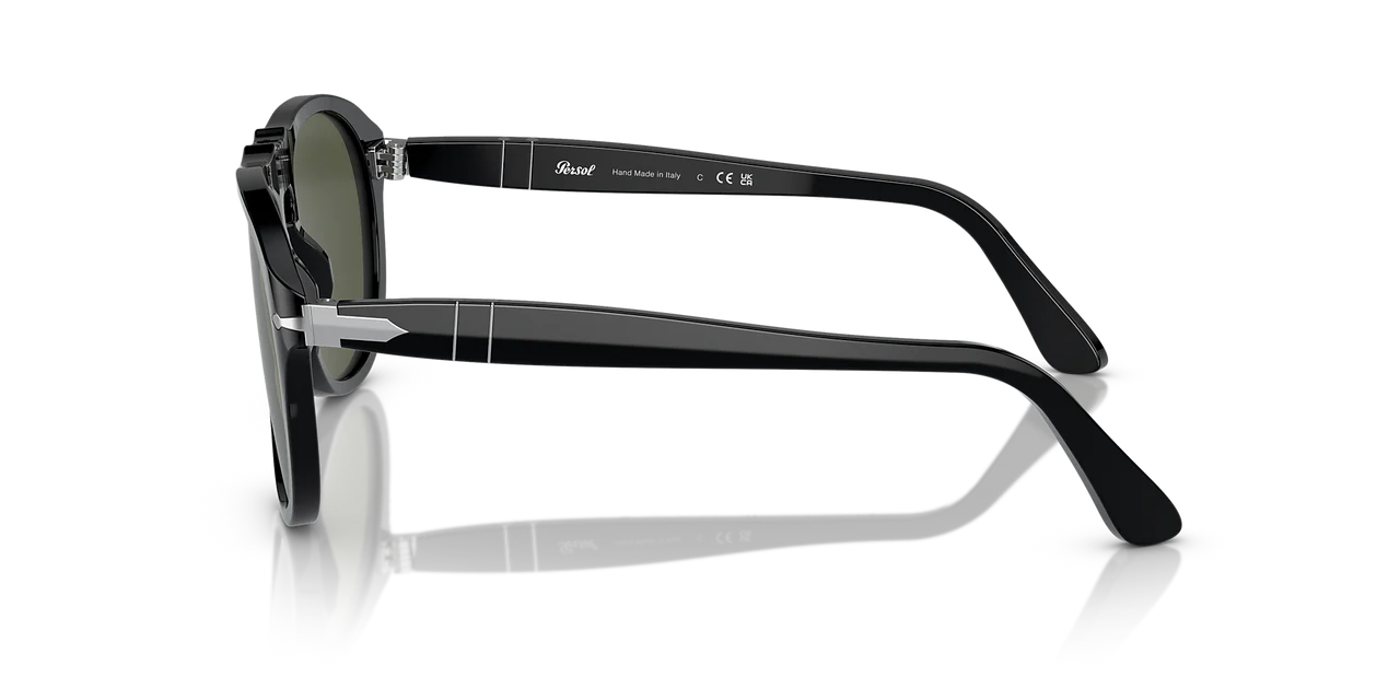 Occhiale da sole Persol modello maschile in celluloide nero lucido forma a goccia le lenti sono di colore verde g15