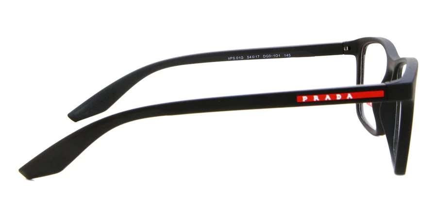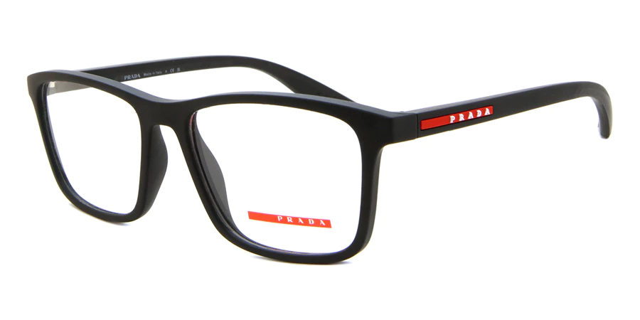 Occhiale da vista uomo con montatura di colore nero e scritta Prada rossa