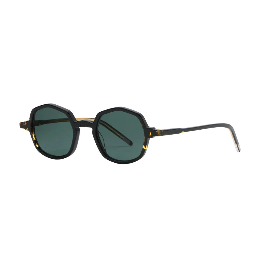 Occhiale da sole in celluloide dalla forma geometrica esagonale di colore nero-havana con lenti verde scuro